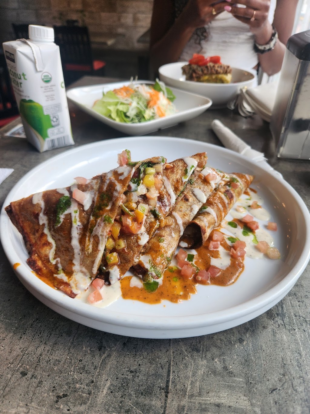 Everything was exceptional on our visit. This place is 100% vegan. The waitress was extremely friendly and accommodating. We went on a Tuesday afternoon and there were only a few other people there. We got the La Chori Pizza, the quesadilla, and the gyro. The first two were our favorite by far. We also got one of each of their deserts and those didn’t disappoint. We would definitely visit again if we ever come back to Puerto Rico.